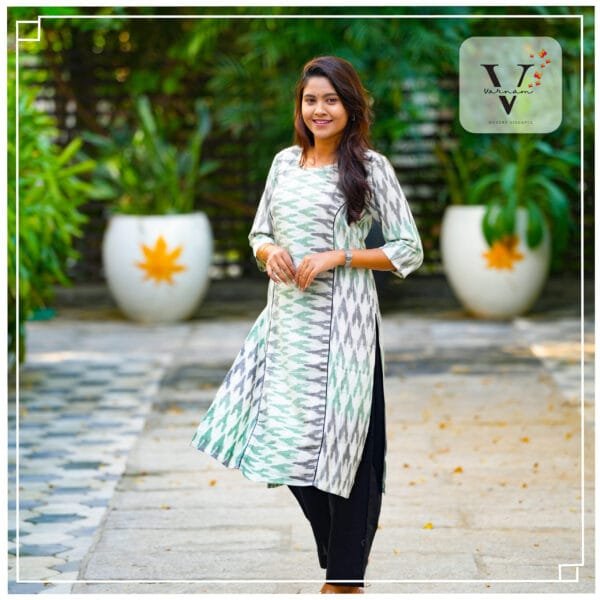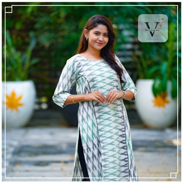 Upgrade your fashion game with our elegant Straight Cut Kurti. The classic combination of white and black stripes gives this Ikkat Cotton Princess Cut Kurta a timeless appeal. Crafted with precision, it offers a perfect blend of sophistication and comfort.The white base color of the kurti provides a clean and fresh look, while the black stripes add a touch of boldness and style. The intricate Ikkat pattern showcases traditional craftsmanship and adds an element of charm to the ensemble.