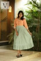 | Description | Pure cotton Anarkali. Combination of orange and pastel lurex green shade with a printed button style. 3/4th sleeve, frilled round neck. suitable for party and casual wear Length: 47 inches | Yarn-dyed viscose fabric which is lightweight . comfortable for casual wear. Yarn dyed lines in horizontal and vertical positions. 3/4th sleeve, round neck Kurti. Length: 47 inches. | Introducing a timeless Long Box Pleated Kurta with black stripes, designed to make a statement. The kurta features 3/4th sleeves, adding a touch of elegance. | Cotton blend with fabric. Checked patterns combined with rhomboid patterns. 3/4th sleeves with rhomboid borders. Length: 46 inches. | Brushed texture ,rayon fab ,A line top 3/4th sleeve | pure viscose flax raw linen. long A line top with black yarn dyed checks. 3/4th sleeves with mid-string matching ribbon. | ||||||||||||||||||||||