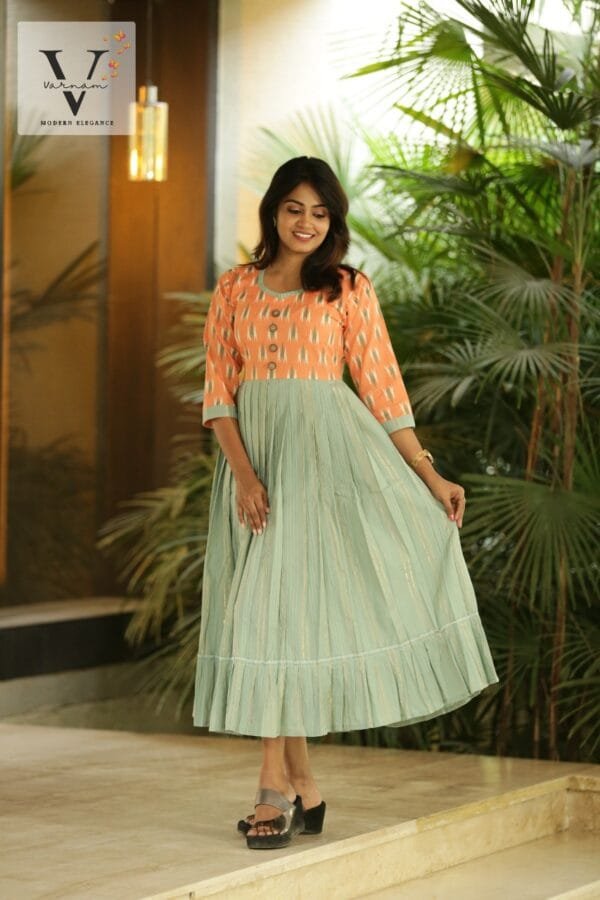 Introducing our enchanting Pure Cotton Anarkali, a perfect blend of vibrant orange and pastel lurex green shades that will make you the center of attention at any event. This exquisite Anarkali effortlessly combines traditional elegance with contemporary style, ensuring you stand out with its unique charm. The captivating blend of orange and pastel lurex green shades creates a stunning visual harmony. The vibrant orange adds a pop of energy and radiance, while the subtle shimmer of the lurex green infuses a touch of glamour, making this Anarkali truly extraordinary.